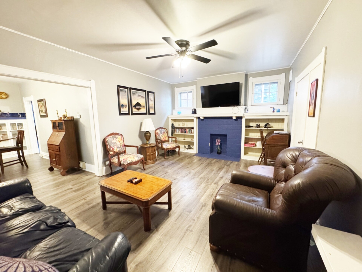 Upon entering, you're greeted by a spacious living area adorned with interesting and eccentric decor, creating an inviting ambiance perfect for relaxation or entertaining guests. The hardwood floors add warmth and character to the space, complementing the cozy atmosphere.